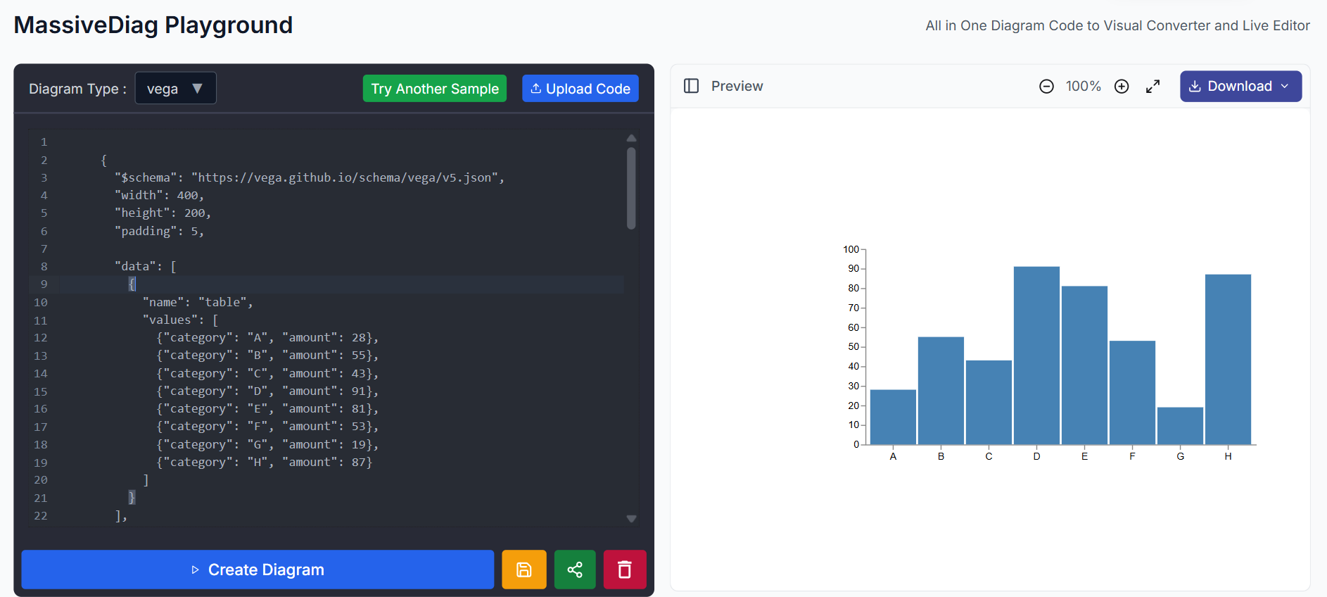 Tempelkan Kode ke MassiveDiag Playground atau unggah kode Vega.